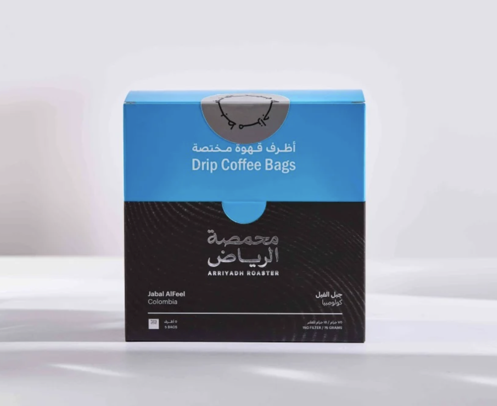 خمسة أظرف مميزة بتصميمها العملي، يحتوي كل منها على 15 جرام من قهوة (جبل الفيل) الكولومبية بإيحاءاتها المميزة بين حلاوة الشوكولاتة و الفواكة الحمراء و حموضة البرتقال والمكسرات.