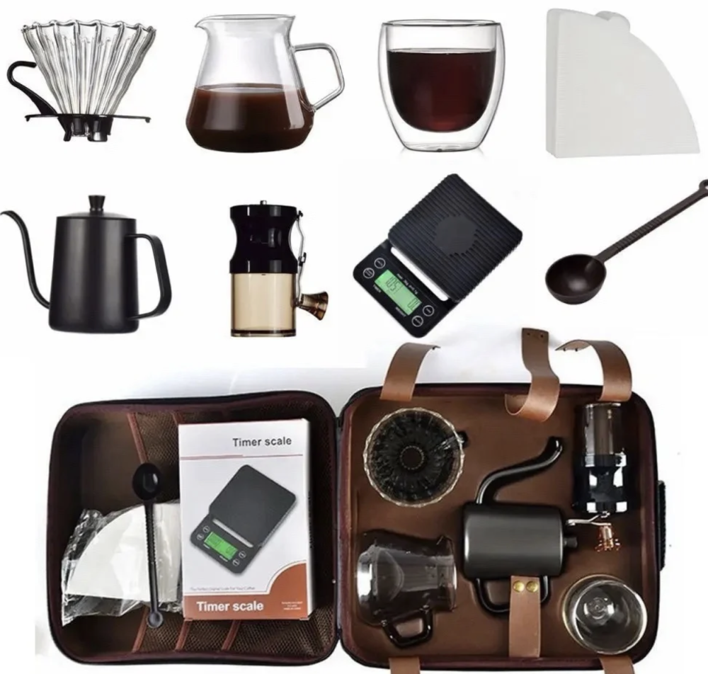 عبارة عن مجموع 9 قطع ، وتتكون من التالي : - شنطة فاخرة لحمل أدوات القهوة . - ابريق تقطير ستيل 600 مل - مطحنة يدوية | Hand Grinder - قمع ترشيح زجاجي 02 | V6 Dripper - سيرفر زجاجي 600 مل | Coffee Server - ميزان مع مؤقت | Scale with Timer - كوب زجاجي دبل سعة 200 مل - ملعقة - 100 فلتر ورقي - معيار حرارة